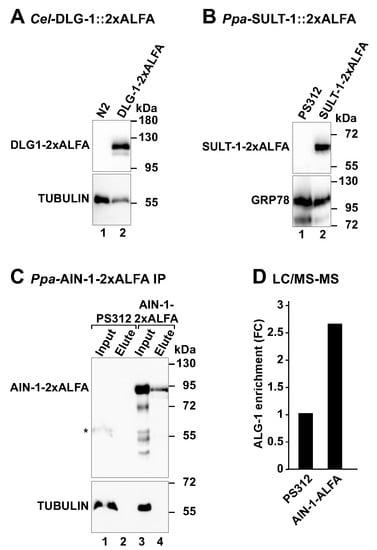 Affinity purification coupled with mass spectrometry is a commonly used approach to purify protein complexes from cells. We applied the ALFA system to capture, for the first time, an ALFA-tagged protein and its associated proteins in a multicellular organism. We incubated P. pacificus PS312 and Ppa-ain-1(tu1753[ain-1::2xALFA]) worm lysates with the anti-ALFA nanobody immobilized on an agarose-based resin. After washing, the nanobody-bound proteins were competed with an excess of free ALFA peptide. The resulting eluted proteins were analyzed by SDS-PAGE and immunoblotting (Figure 4C). The Ppa-AIN-1-2xALFA protein successfully bound to the ALFA resin and was specifically eluted following the incubation with the free ALFA peptide (Figure 4C, upper panel, lane 4). In contrast, TUBULIN did not bind to the resin and therefore was only detected in the worm lysates (Figure 4C, bottom panel, lanes 1 vs. 2 and 3 vs. 4).