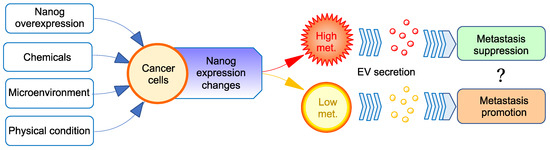 Paradoxical effects of EVs from Nanog-overexpressing cancer cells on their metastasis. Nanog expression level in cancer cells can be changed by genetic, chemical, microenvironmental, or physical factors. The higher the Nanog expression level, the higher the metastatic potential. The role of EVs in cancer metastasis has been thought to follow the metastatic potential of cancer cells, that is, EVs derived from metastatic cancer cells exhibit metastasis-promoting effects. However, in the case of cancer cells with a very high metastatic potential, contrary to our expectations, EVs may promote cancer metastasis.