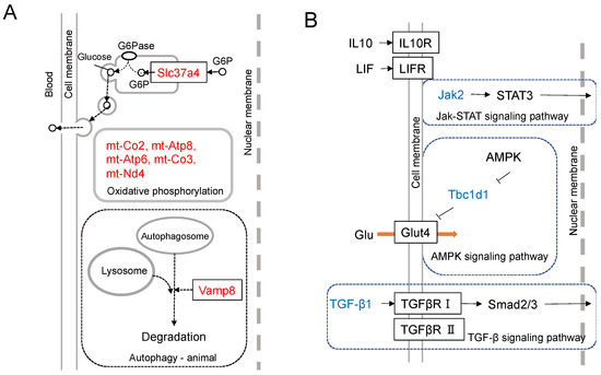 Results of transcriptome analysis. (A) Differential expression of Nanog-dependent genes between Nanog+BL6 and B16-BL6 cell lines. Assumed-role diagrams of up-regulated top-7 genes (Slc37a4, mt-Atp6, mt-Nd3, mt-Co3, mt-Atp8, mt-Co2, and Vamp8). (B) Differential expression of Nanog-dependent genes between Nanog+BL6 and B16-BL6 cell lines. Assumed-role diagrams of down-regulated top-3 genes (Jak2, Tbc1d1, and TGF-β1).