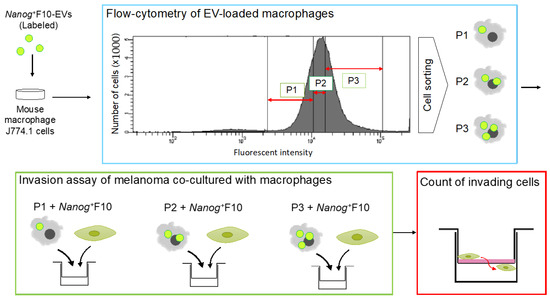 Experimental protocol to analyze the effects of EV-uptake quantity on the invasion ability of macrophages. EVs are labeled with a fluorescent probe. J774.1 cells are fractionated, with a cell sorter, into P1, P2, and P3 fractions, respectively, according to the intensities of fluorescence of EVs. Each fraction of J774.1 cells is co-cultured with Nanog+F10 cells and tested for invasion ability with Transwell® invasion assay kits. The number of melanoma cells that invade the Transwell membrane are counted.