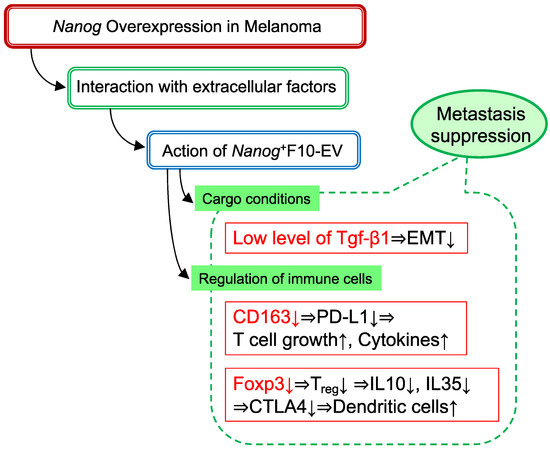 As a mechanism of the metastasis-suppressive effect, (i) the effect of Tgf-β1 in EV and (ii) the tumor suppressive effect by immune cells (macrophages, Tregs) were presumed. Regarding (i), B16-F10, Nanog+F10, F10-EV, Nanog+F10-EV, and Tgf-β1 knockdown cell lines and EVs obtained from them (Tgf-β1(−)-F10, Tgf-β1(−)-F10-EV) were used. Tgf-β1 gene expression level and protein concentration (pg/μg EVs) in those cell lines—and EVs therefrom—were analyzed. The concentration of Tgf-β1 protein in EVs and the effect on metastasis were summarized as F10-EV (3.9 pg/μg EVs, promotive), Nanog+F10-EV (1.6 pg/μg EVs, suppressive), and Tgf-β1(−)-F10-EV (0.5 pg /μg EVs, suppressive) [20]. At high concentrations of Tgf-β1, the role of Tgf-β1 was the promotion of metastasis. In contrast, it turned into the suppression of metastasis at lower levels than a threshold of 1.6–3.9 pg/μg EVs.