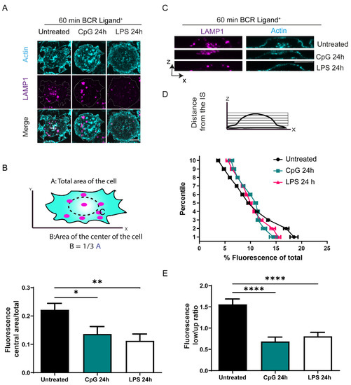 Our results show that B cells treated with TLR ligands do not efficiently recruit lysosomes to the IS. We investigated this effect further and analyzed the distribution of lysosomes at the synaptic interface under TLR stimulation. For this purpose, B cells pre-treated or not with TLR ligands were plated onto glass slides coated with a BCR ligand+ and incubated for 60 min. Images taken by confocal microscopy of the synaptic plane of control B cells showed that lysosomes are recruited at a central area. As reported in previous work, this area most likely corresponds to the central supramolecular activation complex (cSMAC) where BCRs also gather [41]. In contrast, lysosomes from B cells pre-treated with CpG or LPS presented a more peripheral localization at the synaptic interface (Figure 2A,B). Lysosome distribution in the whole cell, was evaluated by taking XZ images of B cells activated on antigen-coated coverslips and labeled for Lamp1. The fluorescence signal for Lamp1 was measured across the Z dimension, as shown in Figure 2C. Measurements corresponding to lysosomes in each Z plane revealed a progressive enrichment of lysosomes at the synaptic interface of control cells. In contrast, we found that B cells treated with CpG or LPS presented fewer lysosomes in planes next to s and were concentrated further away from IS (Figure 2D). Indeed, the ratio of fluorescence distribution of lysosomes between the lower (Fluorescence low) and upper (Fluorescence up) halves of the cell decreased in CpG or LPS-treated B in comparison to control cells (Figure 1E). Thus, TLR stimulation decreases lysosome recruitment to the IS, which is correlated with their poor antigen extraction and presentation capacity.