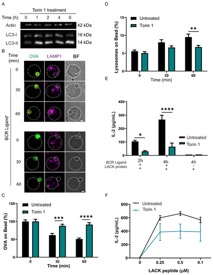 Induction of autophagy, independently of TLR stimulation, decreases antigen extraction and presentation by B cells. (A) immunoblot showing levels of LC3-II in B cells treated with Torin 1 at different time points; a representative blot of 3 independent experiments is shown. (B) Representative images of control and Torin 1-treated B cells incubated with beads coated with OVA and BCR ligand+ (anti-IgG) for different periods of time. Cells were fixed and stained for OVA (green) and LAMP-1 (magenta). Images are shown as Z-projections of a stack. Scale bar = 3 µm. N = 3. (C) Quantification of OVA fluorescence remaining on the bead, normalized by initial fluorescence. *** p < 0.001, **** p < 0.0001. N = 3. (>55 cells). Two-way ANOVA with Sidak’s multiple comparison test. (D) Quantification of lysosome accumulation at the IS. ** p < 0.01. N = 3. (>55 cells). Two-way ANOVA with Sidak’s multiple comparison test. (E) Antigen presentation assay of control or Torin 1-treated B cells. Levels of IL-2 secretion by T cells were quantified by ELISA * p < 0.05, **** p < 0.0001. N = 3. (F) Representative graph of peptide controls for cells used in antigen presentation assays.
