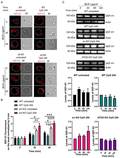 We next focused on how autophagy regulates lysosome polarization to the IS. For this reason, we investigated the role of GEF-H1, which has been described as being involved in the tethering and fusion of lysosomes at the immune synapse. GEF-H1 is a microtubule-associated Rho GTP exchange factor that regulates RhoA activation in response to RalA GTPase, which in turn regulates the localization and assembly of exocyst components [43]. In B cells, GEF-H1 controls both the assembly and recruitment of the exocyst complex to the synaptic membrane, thereby enabling lysosome tethering and secretion to facilitate antigen extraction and presentation [9]. Interestingly, the levels of GEF-H1 were shown to be controlled by autophagy in fibroblasts [44]. Therefore, we asked whether levels of GEF-H1 were also regulated similarly in B cells. To this end, we evaluated whether the recruitment of GEF-H1 to the IS was affected upon activation with TLR ligands by imaging analysis. We observed less GEF-H1 in the synaptic area of CpG-treated control B cells. Surprisingly, αV KO B cells displayed higher levels of GEF-H1 at the IS compared to control cells, and recruitment was more pronounced in αV KO B cells pretreated with CpG (Figure 6A,B). Next, we evaluated whether the reduced recruitment of GEF-H1 to the IS was due to lower levels of GEF-H1 caused by increased levels of autophagy in cells stimulated with CpG. For this purpose, we measured the levels of GEF-H1 in B cells with or without autophagy induced by CpG under BCR engagement and resting conditions. Control and αV KO HBL1 cells were pretreated for 24 h with CpG, then seeded on BCR-ligand+ plates for different periods of time, and levels of GEF-H1 were measured by Western Blot. As shown in Figure 6C, untreated control cells showed an increase in the levels of GEF-H1 at 30 min of BCR activation and then a decrease and stabilization of their levels at later time points. CpG-treated wild-type cells have lower levels of GEF-H1 at all time points of BCR activation compared to untreated cells. In contrast, αV KO B cells which have a defect in TLR-induced autophagy showed higher levels of GEF-H1 during BCR activation, suggesting that the degradation of this protein is regulated by autophagy induced by TLR ligands. To confirm the role of autophagy in GEF-H1 degradation, we performed a similar experiment in HBL1 cells where ATG5, an essential autophagy factor, was knocked out using CRISP-Cas9. As expected, the levels of GEF-H1 did not change significatively upon BCR stimulation, confirming that the autophagy machinery regulates GEF-H1 degradation (Figure 6C). Overall, these results show that levels of GEF-H1 are reduced in CpG-treated B cells by induction of TLR-associated autophagy. Consequently, lower levels of GEF-H1 are recruited to the IS, thus explaining why lysosomes do not efficiently accumulate at the synaptic membrane upon treatment with TLR ligands.