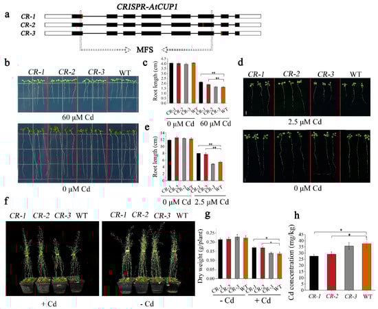 Disruption of the AtCUP1 domain enhanced Cd tolerance and reduced Cd accumulation. (a) Schematic diagram of three CRISPR-AtCUP1 lines. The rectangle inside the dotted line indicates the MFS domain. The black rectangle marks the exon of AtCUP1, the straight line shows the intron of AtCUP1, and the red box indicates the location of the sgRNA. (b,c) Growth and root length measurements of three CRISPR-AtCUP1 lines growing in 1/2 MS medium containing 0 or 60 μM Cd. (d,e) Growth and root length measurements of three CRISPR-AtCUP1 lines cultured in hydroponic solution containing 0 or 2.5 μM Cd. (f) Growth status of three CRISPR-AtCUP1 lines grown in pot soil with or without Cd. (g,h) Dry weight and Cd concentration of three CRISPR-AtCUP1 lines grown in pot soil with and without Cd. Three independent experiments, each in triplicate, were performed for each measurement. The error bar represents standard deviation. Statistical analysis was performed by Student’s t-test (* p < 0.05, ** p < 0.01).