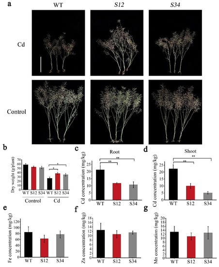 The field experiment for CRISPR-BnCUP1 lines. (a) Growth status of three lines (WT, S12 and S34) planted in Cd-contaminated fields and control fields. Bars indicate 50 cm. (b) Dry weight of seven-month-old WT, S12 and S34 oilseed rape grown in Cd-contaminated fields and control fields. (c,d) Cd concentration in roots and shoots of WT, S12 and S34 oilseed rape, respectively. (e,f,g) Concentrations of Fe, Zn and Mn in WT, S12 and S34 oilseed rape grown in Cd-contaminated fields. All data were obtained from independent triplicate experiments and the error bar represents standard deviation. Statistical analysis was performed by Student’s t-test (* p < 0.05, ** p < 0.01).