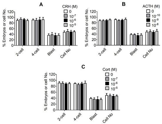 In vitro matured (MII) pig oocytes showing the first polar body (PB1) were chemically activated and cultured in the presence of different concentrations of CRH, ACTH or cortisol for 7 days before examination for embryo development. The results revealed no significant effects of any concentration of any hormone tested on any stage of embryo development (Figure 1). Because it is known that the stress-induced serum concentrations of CRH [20], ACTH [21] and cortisol [22] in pigs are 1 × 10−8 M, 3 × 10−11 M and 4 × 10−7 M, respectively, our results suggest that none of the three hormones impaired development of pig preimplantation embryos even at levels much higher than the physiological concentrations.