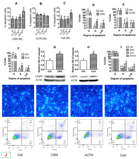 Effects of treatment with corticotrophin-releasing hormone (CRH), adrenocorticotropic hormone (ACTH) or cortisol (Cort) on the apoptosis of pig oviduct epithelial cells (OECs). While graphs (A–C) show Hoechst staining-revealed percentages of apoptotic cells following culture of OECs with different concentrations of CRH, ACTH or Cort, respectively, graphs (D–F) show flow cytometry-revealed percentages of healthy (H), early apoptotic (E) and late apoptotic/necrotic (L/N) cells, following the culture of OECs with CRH (2 × 10−6 M), ACTH (1 × 10−8 M) or Cort (1 × 10−6 M), respectively. Graphs (G,H) show relative levels of active caspase 3 (CASP3) as revealed by Western blotting after the OECs were cultured with CRH (2 × 10−6 M) and Cort (1 × 10−6 M), respectively. Graph (I) shows flow cytometry-revealed percentages of healthy (H), early apoptotic (E) and late apoptotic/necrotic (L/N) cells, following the culture of OECs without hormone (Ctrl) or with CRH (1 × 10−8 M) or Cort (4 × 10−7 M) alone or both (Ch + Ct). Each treatment was repeated three times with each replicate including cells from one well of a 12-well culture plate. a–d: Values with a different letter above bars differ (p < 0.05). Panel (J) shows micrographs after Hoechst 33342 staining (upper row) and the flow cytometry graphs (lower row) following OECs were cultured with CRH (2 × 10−6 M), ACTH (1 × 10−8 M) or Cort (1 × 10−6 M), respectively. Control (Ctrl) OECs were cultured without stress hormone. In the Hoechst-staining micrographs, the apoptotic cells with pyknotic nuclei were heavily stained by Hoechst 33342 emitting bright light. The micrographs were taken at an original magnification of ×400. In the flow cytometry graphs, the healthy, early apoptotic and late apoptotic/necrotic cells are located in the Q4, Q3 and Q2 areas, respectively. The Q1 area contains mechanically damaged cell debris.