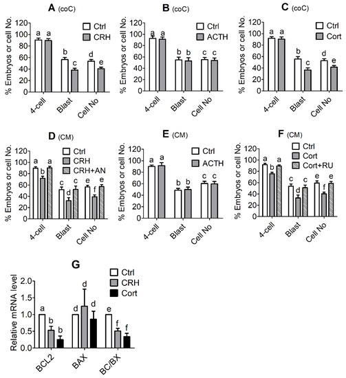 In vitro development and apoptosis of pig embryos cocultured with oviduct epithelial cells (OECs) in the presence of corticotrophin-releasing hormone (CRH), adrenocorticotropic hormone (ACTH) or cortisol (Cort) or cultured in medium conditioned by OECs pretreated with CRH, ACTH or cortisol. In graphs (A–C), MII oocytes showing first polar body (PB1) were chemically activated and cocultured (coC) with OECs in the presence of CRH (2 × 10−6 M), ACTH (1 × 10−8 M) or Cort (1 × 10−6 M), respectively, before observation for embryo development. Control (Ctrl) oocytes were cocultured with OECs without stress hormones. In graphs (D–G), activated oocytes were cultured in conditioned medium (CM) before examination for embryo development or apoptosis, and the CM was conditioned for 24 h with OECs that had been pretreated for 48 h with CRH (2 × 10−6 M), ACTH (1 × 10−8 M) or Cort (1 × 10−6 M), respectively. Control CM was conditioned with OECs pretreated without stress hormones. CRH + AN: OECs were pretreated for 48 h with both CRH and antalarmin (2 × 10−6 M); Cort + RU: OECs were pretreated for 48 h with both Cort and RU486 (1 × 10−6 M). While 2-cell and 4-cell embryos were observed at 48 h, blastocysts were observed on day 6 after the onset of embryo culture. Percentages of 2-cell, 4-cell and blastocyst (Blast) embryos were calculated from MII oocytes, 2-cell and 4-cell embryos, respectively. Graph G shows mRNA levels of BCL2 and BAX and the ratio of BCL2/BAX (BC/BX) as measured by one step RT-PCR. a–f: Values with a different letter above the bars differ significantly (p < 0.05).