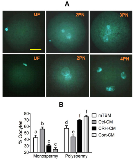 Fertilization of pig oocytes in modified Tris Buffer Media (mTBM)-Conditioning Media (mTBM-CM) conditioned with corticotrophin-releasing hormone (CRH)- or cortisol (Cort)-pretreated oviduct epithelial cells (OECs). Panel (A) shows micrographs of unfertilized (UF) oocytes, and fertilized oocytes with two (2PN), three (3PN) or four pronuclei (4PN) as observed under a fluorescence microscope at a magnification of ×400 following Hoechst 33342 staining. The bar is 32 μm and applies to all images. Graph (B) shows percentages of oocytes with monospermy or polyspermy after insemination of oocytes in mTBM alone, or in mTBM-CM conditioned with OECs without hormone pretreatment (Ctrl-CM), or with OECs pretreated with either CRH (CRH-CM) or cortisol (Cort-CM). a–f: Values with a different letter above the bars differ significantly (p < 0.05).