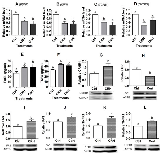 Effects of culture with corticotrophin-releasing hormone (CRH) or cortisol (Cort) on expression of growth factors, oviduct-specific glycoprotein (OVGP1), Fas ligand (FASL)/tumor necrosis factor (TNF) α and their receptors, and CRH/glucocorticoid receptors (GR) in pig oviduct epithelial cells (OECs). Pig OECs were cultured without (Ctrl) or with CRH (2 × 10−6 M) or Cort (1 × 10−6 M) for 48 h before examination. Graphs (A–D) show relative levels (RT-PCR results) of brain-derived neurotropic factor (BDNF), insulin-like growth factor 1 (IGF1), transforming growth factor β1 (TGFB1) and OVGP1 mRNAs, respectively. Graphs (E,F) show levels of FASL and TNFα proteins (ELISA results), respectively. Graphs (G–L) show relative levels of CRH receptor (CRHR1), GR, FAS and TNFR1, respectively, as revealed by Western blotting. a–c: Values with a different letter above bars differ significantly (p < 0.05).