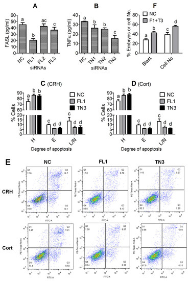 Effects of knocking down Fas ligand (FASL) or tumor necrosis factor (TNFα) on corticotrophin-releasing hormone (CRH)- or cortisol (Cort)-induced apoptosis of oviduct epithelial cells (OECs). Graphs (A,B) show FASL and TNFα concentration, respectively, in CM conditioned for 48 h without hormones with OECs transfected with negative control (NC), FASL siRNA-1 (FL1), -2 (FL2) or -3 (FL3), or with TNFα siRNA-1 (TN1), -2 (TN2) or -3 (TN3). Graphs (C,D) show the percentages of healthy (H), early apoptotic (E) or late apoptotic and necrotic (L/N) cells as revealed by flow cytometry following OECs transfected with NC, FL1 or TN3 siRNAs were cultured for 48 h in the presence of CRH and Cort, respectively. Panel (E) shows the flow cytometry graphs after the OECs transfected with NC, FL1 or TN3 siRNAs were cultured with CRH or Cort for 48 h. The healthy, early apoptotic and late apoptotic/necrotic cells are located in the Q4, Q3 and Q2 areas, respectively. The Q1 area contains mechanically damaged cell debris. Graph (F) shows the percentages of blastocysts (Blast) and cell number per blastocyst (Cell No) following embryo culture in CM conditioned in the presence of both 1 × 10−8 M CRH and 4 × 10−7 M cortisol with OECs that had been transfected with NC siRNA or co-transfected with both FASL siRNA-1 and TNFα siRNA-3 (F1 + T3). a–d: Values with a different letter above the bars differ significantly (p < 0.05).
