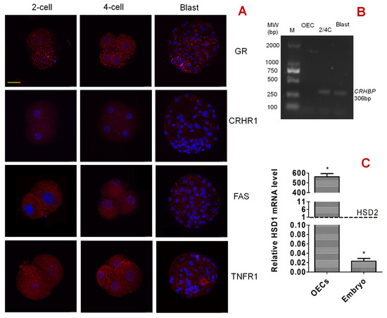 Expression of corticotrophin-releasing hormone receptor (CRHR1), glucocorticoid receptor (GR), FAS, tumor necrosis factor receptor (TNFR1), corticotrophin-releasing hormone-binding protein (CRHBP) and hydroxysteroid 11-beta dehydrogenase 1/2 (HSD11B1/HSD11B2) in pig preimplantation embryos. Panel (A) shows expression of CRHR1, GR, FAS, and TNFR1 in 2-cell, 4-cell and blastocyst (Blast) embryos, as revealed by immunofluorescence microscopy. The micrographs are merged images from laser confocal microscopy with target proteins and DNA colored red and blue, respectively. The bar is 50 μm and applies to all images. While 2-cell and 4-cell embryos were observed at 48 h, the blastocysts were observed on day 6 after the onset of embryo culture. Panel (B) shows mRNA expression of CRHBP in pig oviduct epithelial cells (OECs), 2- or 4-cell embryos (2/4C) and blastocysts (Blast), as revealed by a general PCR amplification. The annealing temperature for the general PCR amplification was set to 58 °C. M: DM 2000 DNA marker. The molecular weight for CRHBP mRNA is 306 bp. Graph (C) shows relative levels of HSD11B1 (HSD1) and HSD11B2 (HSD2) mRNAs in pig embryos and OECs. The level of HSD11B2 mRNA was set as one (dotted line), and the level of HSD11B1 mRNA was expressed relative to it. * Indicates significant difference from the value of HSD11B2.