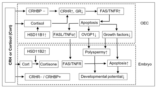 In summary, this study shows that although ACTH showed no effect on pig embryo development, CRH and cortisol impaired preimplantation embryo development and increased polyspermy indirectly by inducing the apoptosis of OECs. Thus, after the treatment of OECs with CRH or cortisol, while the expression level of GR decreased, that of CRHR1, FAS and TNFR1 increased significantly, which would lead to apoptosis (Figure 8). The apoptotic OECs produced more FASL and TNFα but less growth factors and OVGP1. The FASL and TNFα would interact with FAS and TNFR1, respectively, on the embryo, which, together with a desperate shortage of growth factors, would trigger the apoptosis of embryos. The increased polyspermy was associated with a decrease in OVGP1 and growth factors. Both apoptosis and polyspermy would contribute to the decreased developmental potential of embryos. Pig preimplantation embryos did not express CRHR1 but did express CRHBP, which might lead to their insensitivity to CRH. Pig preimplantation embryos expressed more HSD11B2 than HSD11B1, which converts cortisol to inactive cortisone and might contribute to their tolerance to cortisol. Furthermore, when used at a stress-induced physiological concentration, while culture with either CRH or cortisol alone showed no effects, culture with both significantly increased OECs apoptosis, suggesting that in vivo, both hormones may work together to induce apoptosis of pig OECs.