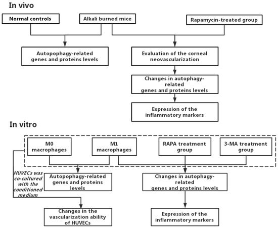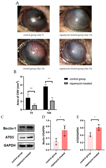 Angiogenesis is a complex process, particularly associated with vascular endothelial cells. Endothelial cell proliferation and migration are prerequisites for capillary formation. Chemokines and proinflammatory cytokines are overexpressed in corneal inflammation and contribute to promoting angiogenesis [34,35]. Alkali burns increased the expression of IL-6 and TNF-α, genes that play a key role in CNV. The polarization of macrophages to M1 type will release inflammatory factors such as IL-6, TNF-α, and IL-1. Among these pro-angiogenic molecules, IL-6 is a pro-inflammatory cytokine produced in corneal chemical burn tissue, which is known to induce the production of angiogenic factors to promote CNV [11,13,36]. TNF-α, which is mainly synthesized by macrophages, also plays a key role in inflammatory diseases, increasing the expression of adhesion molecules and inflammatory mediators in human corneal epithelial cells, and recruiting leukocytes by producing chemokines [37]. Indeed, high levels of IL-6 and TNF-α accumulate substantially in the early alkali burn cornea, subsequently accelerating the progression of the inflammatory state, and eventually inducing the invasion of vascular endothelial cells into the transparent cornea. Our study found that IL-6 and TNF-α expression were not only increased in activated macrophages but also further increased in M1 macrophages with impaired autophagy, causing more severe CNV.