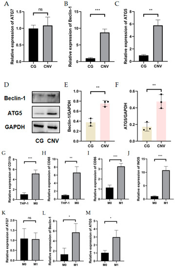 Autophagy is a process that phagocytoses own organelles or cytoplasmic proteins. The substance to be phagocytosed is coated with lysosomes to form autophagysosomes to degrade its coated contents, thereby achieving the metabolic needs of the cell itself and the renewal of certain organelles [31]. Autophagy has been identified as an important factor in the inflammatory response and immune cells. We examined the expression levels of Beclin-1 and ATG5 in THP-1 cells treated with LPS and IFN-γ for 24 h to assess the role of autophagy in M1 macrophage activation. The expression levels of both autophagy-related genes and proteins were significantly increased in M1 macrophages as compared to unactivated M0 macrophages, perhaps as a result of accelerated inflammatory vesicle motility and organelle renewal [32,33]. Although autophagy proteins alone are not enough to initiate or silence inflammation, regulating autophagy and reactivating M0 macrophage polarization to M1 macrophages, we found that autophagy can inhibit M1 macrophage polarization, and instead, impaired autophagy will lead to more severe inflammation. Here, we clearly show that LPS and IFN-γ promote autophagy in macrophages as studies progressed, while the expression levels of ATG5 and Beclin-1 are contrary to the expression trend of M1 markers INOS and CD86, indicating that autophagy may be involved in the regulation of M1 macrophage activation and may inhibit inflammation overdevelopment. Although we did not find in vitro that autophagy can promote the polarization of THP-1 cell lines toward M1 or M2, CNV causes impaired autophagy and develops a strong inflammatory response, suggesting that the autophagic dysfunction in macrophages may lead to a disordered inflammatory response in CNV.