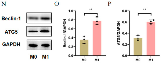 We cultured THP-1 cells (American Type Culture Collection, ATCC, Manassas, VA, USA) in RPMI-1640 complete medium (Gibco, Grand Island, NY, USA) with 10% fetal bovine serum (FBS, Gibco, Grand Island, NY, USA) at 37 °C in a humidified 5% CO2 and 95% air atmosphere. For further experiments, THP-1 cells were incubated with 100 ng/mL phorbol 12-myristate 13-acetate (PMA, AdipoGen, San Diego, CA, USA) for 24 h to obtain M0 macrophages. For the autophagy state regulation, M0 macrophages were pretreated with RAPA (RAPA, Selleck Chemicals, Houston, TX, USA) or 3-methyladenine (3-MA, Selleck Chemicals, Houston, TX, USA) for 4 h, and polarized into M1 macrophages with 100 ng/mL lipopolysaccharide (LPS, InvivoGen, San Diego, CA, USA) + 20 ng/mL interferon-γ (IFN-γ, Cyagen, Santa Clara, CA, USA) stimulation for 24 h. Human umbilical vein endothelial cells (HUVECs) from the ATCC were cultured in Dulbecco’s modified eagle medium (DMEM, Gibco, Grand Island, NY, USA) supplemented with 10% FBS, 50 ng/mL gentamicin, and 50 ng/mL amphotericin B at 37 °C in an atmosphere of 95% O2 and 5% CO2.