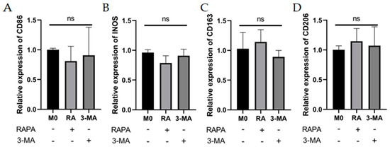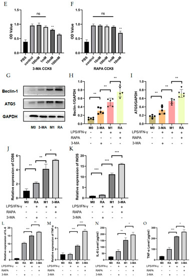 The RT-qPCR results showed no statistically significant effects of RAPA or 3-MA treatment on the M1 (CD86, INOS) and M2 macrophage markers (CD163, CD206) (Figure 3A–D) in M0 macrophages. For M1 macrophages, M1 macrophage-associated markers would be attenuated with increased expression of the autophagy-related proteins (Beclin-1, ATG5), whereas diminished autophagy would give the opposite result. The CCK-8 assay showed that the pretreatment of THP-1 cells with 10 nM–1 mM RAPA and 100 nM–1 mM 3-MA had no significant effect on the cell activity for 4 h (Figure 3E,F). The pretreatments of 100 nM RAPA and 1 mM 3-MA were chosen to establish the regulation of the autophagy model. WB results showed that we successfully regulated the degree of autophagy (Figure 3G–I). Interestingly, 3-MA increased the mRNA expression of INOS and CD86, while RAPA suppressed the increase in M1 mRNA levels in LPS- and IFN-γ-induced M1 macrophages (Figure 3J,K). Detection of IL-6 and TNF-α expression levels at mRNA by RT-qPCR and detection of cytokine levels in cell secretion by ELISA found that the autophagy activator (RAPA) reduced IL-6 and TNF-α expression at mRNA and protein levels, while the autophagy inhibitor (3-MA) enhanced TNF-α and IL-6 expression in M1 macrophages (Figure 3L–O).