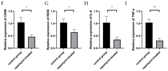 To confirm whether mouse CNV could be alleviated by improving autophagy, alkali burn mice were treated with RAPA. We found a significant reduction in CNV area in alkaline burn mice after RAPA injection, as compared to untreated alkaline burn mice (Figure 5A,B). WB demonstrated the efficacy of RAPA in enhancing macrophage autophagy (Figure 5C–E). The RT-qPCR revealed that the inflammatory markers (INOS, CD86, IL-6, and TNF-α) were significantly reduced in the corneas of RAPA-treated mice compared with alkali burn mice (Figure 5F–I). Thus, we found that RAPA reduces inflammatory cytokine expression and relieves CNV in alkali-burned mice.
