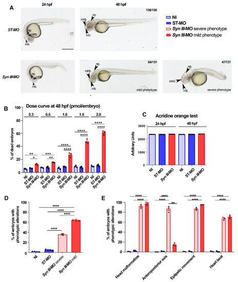 Phenotypic alterations in Syn III-MO-injected zebrafish. (A) Representative images of ST-MO- or Syn III-MO-injected embryos at 24 and 48 hpf. Syn III-MO-injected morphants exhibited mild or severe phenotype at 48 hpf. Scale bar, 500 μm. Abbreviations: mb, midbrain; hb, hindbrain; mhb, midbrain hindbrain boundary. (B) Ascending doses (in pmol/embryos) of Syn III-MO produced significant progressive increase in the percentage of dead embryos that was comparable in ST-MO and control non-injected (NI) embryos. (* p < 0.05, ** p < 0.01, *** p < 0.001, **** p < 0.0001 One-way ANOVA + Newman-Keuls, n = 3 experimental replicates represent the % mean of dead embryos per group from three experiments including at least 20 embryos per group). (C) Acridine orange fluorescence intensity (in arbitrary units) in the embryos injected with 1.0 pmol/embryo of ST-MO or Syn III-MO when compared to NI embryos at 24 and 48 hpf (One-way ANOVA + Newman-Keuls. n = 4 experimental replicates represent the mean fluorescence intensity per group in four experiments including at least 10 embryos per group). (D) At 48 hpf a significantly higher percentage of syn3 KD morphants exhibited mild the phenotype (**** p < 0.0001; one-way ANOVA + Newman-Keuls, n = 3 experimental replicates represent the % mean of embryos with phenotypic alterations per group from three experiments including at least 20 embryos per experimental condition). (E) At 48 hpf, a significantly higher percentage of mild and severe Syn III-MO-injected morphants exhibited head malformations, hyperactive movements, and heartbeat. Anteroposterior axis alterations frequency was significantly increased in the severe phenotype vs. mild phenotype syn3 KD morphants (**** p < 0.0001, ** p < 0.05, one-way ANOVA + Newman-Keuls, n = 3 experimental replicates represent the % mean of embryos with phenotypic alterations per group from three experiments including at least 20 embryos per experimental condition).
