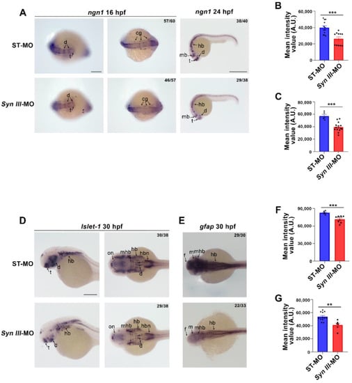 Expression of ngn1, Islet-1 and gfap is reduced in Syn III-MO injected embryos. (A) Representative images of ST-MO and Syn III-MO-injected zebrafish embryos hybridized with ngn1 at 16 hpf and 24 hpf. Abbreviations: mb: midbrain, hb, hindbrain; cg, cranial ganglia; t, telencephalon; d, diencephalon. 16 hpf scale bar, 200 μm; 24 hpf scale bar, 500 μm. (B,C) Quantification of ngn1 signal at 16 hpf (B) and 24 hpf (C) as mean intensity values in arbitrary units (A.U.). Syn III-MO-injected embryos showed a significant decrease in the mean intensity value when compared to control embryos (*** p < 0.001, unpaired Student’s t-test, n = 12 embryos per group). (D,E) Representative images showing 30 hpf embryos hybridized with Islet-1 (D) and gfap (E), scale bar = 200 μm for all the panels. Abbreviations: d, diencephalon; f: forebrain; hb, hindbrain; hbn, hindbrain neurons; mhb, midbrain hindbrain boundary; mb, midbrain; on, optic nerve; t, telencephalon. (F,G) Quantification of Islet-1 (F) and gfap (G) signal expressed as mean intensity values. Syn III-MO-injected embryos exhibited a significant decrease of both Islet-1 ((F), *** p < 0.001 unpaired Student’s t-test) and gfap when compared to control embryos ((G), ** p < 0.01, unpaired Student’s t-test). n = 6–15 embryos per group).
