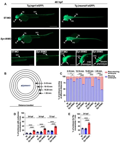 Finally, we evaluated whether syn3 KD-induced reduction of neuronal development could affect zebrafish motility by studying touch-evoked swimming at 3 dpf. The percentage of Syn III-MO-injected Tg(neurod1:eGFP) embryos exhibiting reduced swimming distance progressively increased within the interval between 5 and 10 mm and >20 mm (Figure 3B,C).