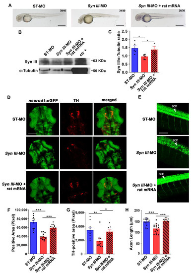 The neurodevelopmental deficits rescued by rat Syn III mRNA expression of Syn III-MO-injected Tg(neurod1:eGFP) embryos involve TH-positive dopaminergic neurons. (A) Representative images showing embryos injected with non-silencing ST-MO, Syn III-MO or Syn III-MO and rat mRNA (Syn III-MO + rat mRNA). Scale bars, 100 μm. (B) Representative WB from protein extracts of ST-MO-, Syn III-MO- or Syn III-MO + rat mRNA-injected Tg(neurod1:eGFP) embryos. The positive control is a protein extract obtained from the striatum of twelve-month-old C57BL/6J wt mice. Alpha-Tubulin bands are representative of the equal loading of samples. (C) Graphs show the ratio between the optical density (o.d.) of Syn III and α-Tubulin of ST-MO, Syn III-MO, and Syn III-MO + rat mRNA-injected Tg(neurod1:eGFP) embryos. Syn III was significantly reduced in the embryos exposed to syn3 KD when compared to either control or Syn III-MO + rat mRNA (* p < 0.05, One-way Anova + Newman-Keuls, n = 5 zebrafish protein pools per experimental condition). (D) Representative images showing TH immunostaining on 48 hpf Tg(neurod1:eGFP) embryos injected with ST-MO, Syn III-MO, or Syn III-MO + rat mRNA. Scale bar, 200 μm. (E) Representative images showing lateral spinal cord views of 48 hpf Tg(neurod1:eGFP) embryos injected with ST-MO, Syn III-MO, or Syn III-MO + rat mRNA. Scale bar, 200 μm. Abbreviations: scn, spinal cord neurons. (F) Quantification of the eGFP-positive area in the diencephalon. *** p < 0.001, one-way ANOVA + Newman-Keuls. n = 11–15 zebrafish embryos per group. (G) Graph shows the TH-immunopositive area (in pixel) of the 48 hpf Tg(neurod1:eGFP) embryos injected with ST-MO, Syn III-MO, or Syn III-MO + rat mRNA. Rat Syn III expression rescued the developmental deficits of TH-positive neurons in syn3 KD embryos (** p < 0.01, * p < 0.05; One-way ANOVA + Newman-Keuls. n = 8–10 zebrafish embryos per experimental condition). (H) Graph shows the spinal cord neuron axon length (in µm) of ST-MO-, Syn III-MO- or Syn III-MO + rat mRNA-injected Tg(neurod1:eGFP) embryos at 48 hpf. Injection of rat Syn III rescued the reduction in spinal neurons axonal length in syn3 KD embryos (*** p < 0.001 Syn III-MO or Syn III-MO + rat mRNA vs. control. One-way ANOVA + Newman-Keuls. n = 15 zebrafish per group).