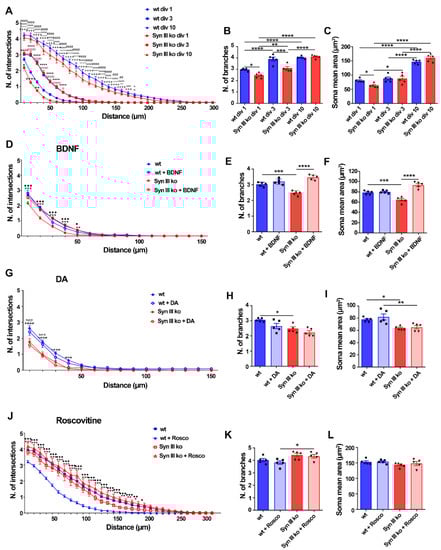Primary midbrain neurons were dissected from C57BL/6J wt control mice and Syn III ko mice at embryonic day 12.5. After dissociation with Accumax (A7089, Sigma-Aldrich), the single cells were re-suspended in whole culture medium composed of NeurobasalTM medium (21103049, Thermo Fisher Scientific, Waltham, MA, USA) containing 100 μg/mL penicillin, 100 μg/mL streptomycin (P4333, Sigma-Aldrich), 2 mM glutamine (ECB3000, EuroClone, Milan, Italy) and 2% B27 supplement (17504044, Thermo Fisher Scientific) and then centrifuged. Cell counts and viability assays were performed using the Trypan Blue exclusion test. Neurons were seeded onto glass coverslides in 24-well plates coated with 12 µg/mL poly-D-lysine. Cells were maintained at 37 °C under a humidified atmosphere of 5% CO2 in Neurobasal medium for 1, 3 or 10 days in vitro (div).