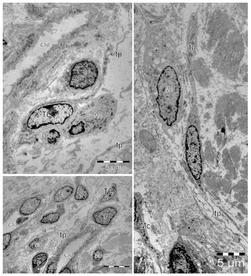 TCs are present within the dermis of the skin [,]. Dermal TCs microscopically repeat almost all their well-acknowledged morphological features but also have specific distribution patterns in the reticular dermis. Herein, TCs’ distribution suggested some specific implications in skin homeostasis. The skin stem cells niche is well acknowledged. It is located within the space delimited by the hair follicle, the secretory duct of the sebaceous gland, and the hair insertion of the arrector pili muscle. TCs are part of this niche []. In this respect, supplemental data was provided by immunohistochemical, mRNA, and proteomics profiling of TCs []. However, some previously documented cases of TCs’ maldistribution and/or ultrastructural changes in some skin pathologies indicate, somewhat ambiguously (based only on IHC studies), some specific changes in TCs. Those changes were mentioned as having a direct relation with dominant pathologic conditions with respect to the underlying physiopathology of the given skin disorder []. However, after bleomycin treatment, the underlying dermis contains a reduced number of TCs, with swollen cell bodies with cytoplasmic vacuolization and interrupted and shortened Tps [].