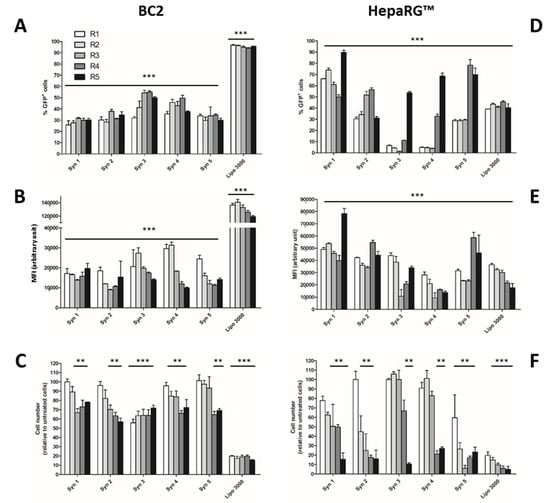 Transient transfection of BC2 and progenitor HepaRG™ cells. The cationic liposomes Syn 1 to Syn 5 and Lipofectamine® 3000 were used to transfect the pmax-GFP plasmid into BC2 and progenitor HepaRG™ cells at five different charge ratios (R). The transfection efficiency was quantified by flow cytometry to determine the percentage of GFP+ cells (A,D) and the fluorescence intensity (B,E). Since non-transfected control cells did not express GFP, all lipofection reagents allowed detection of GFP+ cells (≥5%) and intensities of fluorescence (MFI) significantly higher than those of non-transfected cells (*** p > 0.001). The cell viability was estimated by counting the total cell number in each condition using the flow cytometer. The results are expressed in percentage of cell number compared to non-transfected control cells (C,F). For the cell viability assay, statistically significant differences are presented as ** p < 0.01, *** p < 0.001, for non-transfected versus transfected conditions.