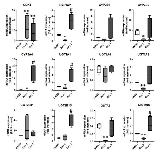 Expression of the proliferation marker CDK1 and liver specific functions during proliferation of differentiated HepaRG™ cells. The relative mRNA expression level of CDK1 and hepatic markers (albumin, CYP1A2, CYP2E1, CYP3A4, UGT1A1, UGT1A6, UGT1A9, UGT2B6, UGT2B15, UGT2B11 and GSTA2) were measured by RT-qPCR during proliferation (protocol from Figure 3B). Analyses of gene expressions were performed in cells always kept in the differentiation medium (MIL700 + ADD720 containing DMSO (DMSO on the chats), and in stimulated cells at days 2 and 3 of the proliferation protocol. Statistics: Significantly different for non-transfected (DMSO) versus transfected conditions at day 2 as * p < 0.05, ** p < 0.05, and between non-transfected (DMSO) versus transfected conditions at day 3 # p < 0.05, mean of 3 to 4 independent experiments.