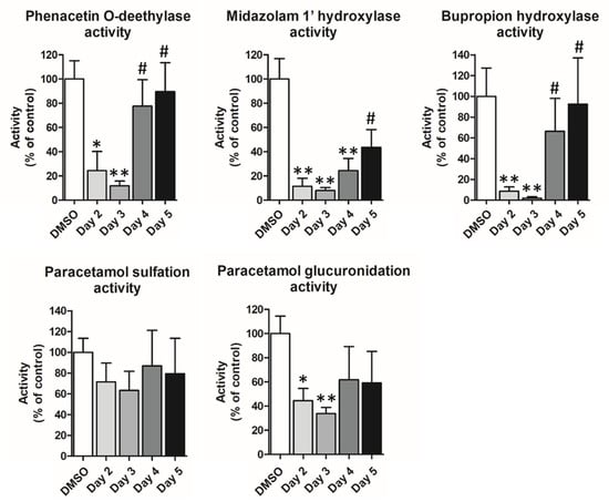 Catalytic activities of phase I and phase II enzymes during proliferation of differentiated HepaRG™ cells. The Vmax of phase I and phase II enzymes were measured by LC/MS-MS using synthetic substrates: midazolam, bupropion, phenacetin and paracetamol, in HepaRG™ cells that were not stimulated (DMSO) representing the standard of differentiation, and at different time point of the protocol described in Figure 3. Statistics: Significantly different between transfected conditions at days 2 to 4 versus non-transfected (DMSO) (* p < 0.05 and ** p < 0.01) and between transfected conditions at days 4 to 5 versus transfected conditions at days 2 to 3 (# p < 0.05).