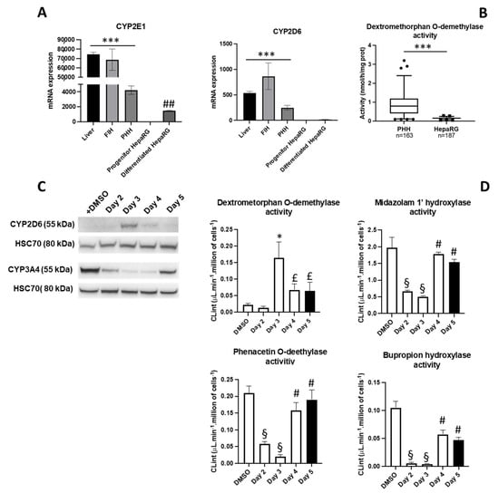 Expression and catalytic activities of CYP2D6 in human hepatocytes and differentiated HepaRG™ cells. The relative amounts of CYP2E1 and CYP2D6 mRNA were investigated by RT-qPCR in biopsies of human normal livers (n = 5), freshly isolated human hepatocytes (FIH, n = 3), primary human hepatocytes cultured for 48h (PHH, n = 4), progenitor (n = 3) and differentiated HepaRG™ cells (n = 3) (A). Significantly different between human livers and primary hepatocytes versus HepaRG™ cells (* p < 0.05) and between differentiated hepatocyte-like and progenitor HepaRG™ cells (# p < 0.05). CYP2D6-dependent dextromethorphan O-demethylase catalytic activities were measured in primary human hepatocytes (n = 163) cells and differentiated HepaRG™ cells (n = 187) (B). Significantly different *** p < 0.001. Expression of CYP2D6 and CYP3A4 was studied by Western blot (C) and CYP2D6-dependent dextromethorphan O-demethylase, CYP3A4/5-dependant midazolam 1′-hydroxylase, CYP1A2-phenacetin O-deethylase and CYP2B6-dependent bupropion hydroxylase catalytic activities (CLint) were measured in differentiated hepatocyte-like HepaRG™ cells and transfected cells at days 2 to 5 (D). Dextromethorphan O-demethylase activities significantly different between transfected conditions at day 3 versus non-transfected (DMSO) and transfected cultures at day 2 (* p < 0.05), between transfected cells at days 4 or 5 versus transfected cultures at day 2 (£ p < 0.05), other catalytic activities significantly different between cultures at days 2 and 3 versus non-transfected (DMSO) cells (§ p < 0.05) and between cultures at days 4 and 5 versus cultures at days 2 and 3 (# p < 0.05).
