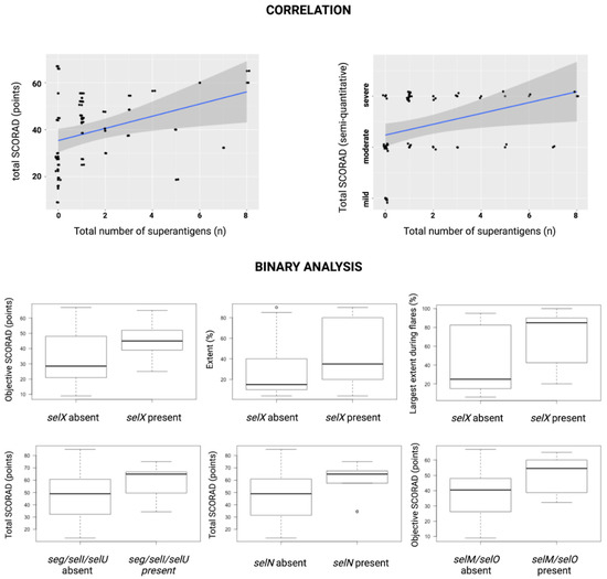 - on the nonlesional skin: selX (22/33 strains, 66.7%), selN (10/33 strains, 30.3%), seg, selI, selM, selO, selU (all identified in 9/33 strains, 27,6%). seb, sed, and see were not identified in any of the isolates;