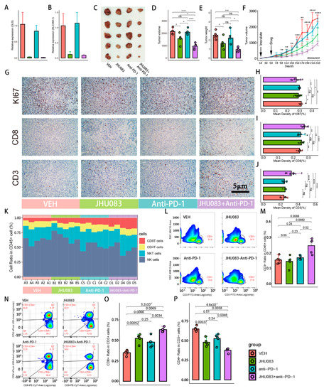Because quantitative immunohistochemical assays are subject to subjectivity and cannot precisely measure cell numbers, we performed flow cytometry to accurately count the abundance of CD8T cells in the tumor tissue. We found a significant increase in T cells for the combined group of PD-1 blocker and JHU083 compared with the individual JHU083 and PD-1 blocker groups (Figure 6L,M). We also counted the numbers of CD8T cells and CD4T cells in the different groups (Figure 6N–P). We detected a higher CD8T cell proportion and a lower CD4T cell proportion in the combined PD-1 blocker and JHU083 group compared with the individual PD-1 blocker and JHU083 groups, but the numbers of CD8T cells and CD4T cells between the PD-1 blocker group and the JHU083 group were not statistically different. Other immune cells, including NKT cells and NK cells, did not change significantly after the administration of the drugs. Sequential changes in the CD8T cells, CD4T cells, NK cells, and NKT cells between the four groups are shown in Figure 6K.