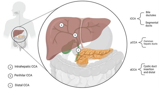 CCA is a heterogeneous group of malignancies, currently being one of the most urgent issues of gastrointestinal oncology. It consists of various malignant tumours that arise from any point along the biliary ducts [3,10]. Based on the most common anatomical features, cholangiocarcinoma can be divided into intrahepatic (iCCA), perihilar (pCCA), and distal (dCCA) [11,12,13]. According to this division, iCCA arises proximally to the second-order bile ducts [14], pCCA is localized between the second-order bile ducts and the insertion of the cystic duct into the common bile duct, whereas dCCA is found distal from the cystic duct insertion [14]. Notably, pCCA and dCCA can be referred to as extrahepatic (eCCA), which corresponds to different pathogenesis and genetics from iCCA [13,15] (Figure 1).