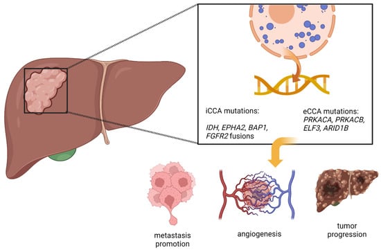 Mutations in CCA, both in iCCA and eCCA, and processes to which they lead.