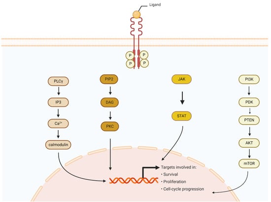 The family of FGFRs consists of four tyrosine kinase receptors, FGFR1-4. They play an essential role in carcinogenesis and a range of physiological signalling pathways. At the early stages of embryonic development, FGFRs are primarily engaged in fundamental cellular interactions and functions [68,69,70]. It is also known that fundamental metabolic functions are controlled by this pathway, such as the regulation of bile acid, fatty acid, glucose, and mineral metabolism [71,72]. Furthermore, FGF23 and FGFR regulation is crucial for bone development and homeostasis by controlling systemic phosphate homeostasis and vitamin D metabolism [73]. Interestingly, angiogenesis can be stimulated by FGFR both in physiological and neoplastic processes. Activation of FGFR1 or FGFR2 has been demonstrated to affect vascular endothelial proliferation positively [74]. At the same time, four FGF receptors need eighteen FGF ligands that activate them for proper signalling [75]. FGFRs are folded with three extracellular-binding ligand domains, a transmembrane domain, and an intracellular tyrosine kinase domain [75]. Depending on the cell characteristics, extracellular domain D3 can alternatively be spliced and formatted as the epithelial (“b” form) or mesenchymal (“c” form) [76]. Interestingly, novel studies showed the presence of FGFR5/FGFRL1 with unknown functions and different morphology [77,78]. Activation of the receptor results in downstream signalling covering pivotal cellular pathways. Binding the proper ligand to FGFR monomers results in dimerization and intracellular phosphorylation with conformational changes. Activated FGFRs phosphorylate FRS2, which opens the way for PI3K, AKT, mTOR, or the RAS/RAF/MEK/MAPK cascade. Activated FGFRs also phosphorylate JAK kinases, which lead to STAT activation. FGFRs can also recruit and phosphorylate PLCγ, thereby initiating signalling through the DAG/PKC or IP3-Ca2+ pathway. Those pathways have a crucial role in tumour development [79,80,81]. The final effects of these pathways are distinct for the cell and include mitogenesis in the MAPK pathway, cell survival in the PI3K pathway, and mobility in the PKC pathway [82] (Figure 3).