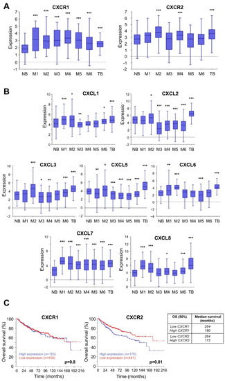 CXCR1/2 and ELR+CXCL cytokines (CXCL1, 2, 3, 5, 6, 7, 8) relative mRNA expression levels were analysed using the R2: Genomics Analysis and Visualization Platform (http://r2.amc.nl (accessed on 1 June 2019)).