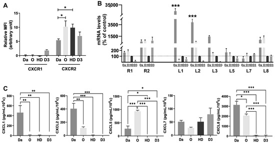 Cells were dissociated with 1X Accutase (HyClone HyQTase, Fisher Scientific (Thermo Fisher)). 107 cells were resuspended in 500 µL of PBS, 0.5% BSA, and 2 mM EDTA. Cells were labelled with anti-human APC-conjugated anti-CXCR1 antibody, PE-conjugated anti-CXCR2 antibody, and the respective isotype control antibody (Miltenyi Biotec, North Rhine-Westphalia, Germany) for 10 min in the dark at 4 °C. Cells were washed twice and centrifuged at 300× g for 10 min. Cell pellets were resuspended in 300 µL of buffer (PBS, 0.5% BSA, 2 mM EDTA) for analysis by FACS Cytoflex (Beckman, Pasadena, CA, USA). The gating was realized with CytExpert 2.3 software associated with Cytoflex. The data were represented with the relative mean fluorescence intensity (MFI).