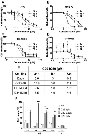 To evaluate the efficacy of this compound in MB cells, we first determined the relative IC50 values for each cell line using XTT assays (Figure 3A–E). The XTT assay is used to measure cellular metabolic activity (overall activity of mitochondrial dehydrogenases) as an indicator of cell viability, proliferation, and cytotoxicity. C29 appears to be less effective in ONS-76 than in all other cell lines at 24 and 48 h (IC50 = 17.9 and 6.8 µM, respectively), whereas HD-MB03 cells appear to be more sensitive to this inhibitor than other cells at 24 and 48 h (IC50 = 2.6 and 1.8 µM, respectively). After 72 h, C29 appears to be more effective on Daoy cells (IC50 = 0.9 µM) and less effective on D341Med cells (IC50 = 4.6 µM). Unexpectedly, C29 stimulated metabolism in D341Med cells over a longer period of time (72 h), but only at low concentrations (0.1 to 2.5 µM). At higher concentrations, it consistently inhibited cell metabolism as in the other cell lines. Overall, IC50 values for all cell lines were in the micromolar range, making C29 a very efficient agent to inhibit cell metabolism and viability.