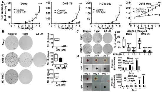 C29 reduces proliferation, migration, and invasion of naïve MB cells. (A) Proliferation of Daoy, ONS-76, HD-MB03, and D341Med wild-type cells after treatment with 1 μM C29 or the control (DMSO), n = 3. (B) Clonogenic assay on Daoy (n = 4), ONS-76 (n = 3) and HD -MB03 (n = 5) cells after treatment with control (DMSO) or C29 (1 μM or 2.5 μM). Scale = 500 μm. (C) Cell migration through the Boyden chamber of Daoy and ONS-76 cells specifically attracted by 200 ng/mL CXCL8. Results are expressed as percentage of control (DMSO) (n = 3). Scale = 1000 μm. (D) Spheroid invasion using 3D culture cell assays on Daoy (n = 4) and ONS-76 cells (n = 3) treated with control (DMSO) or C29 at a concentration of 1 μM on day 0, 1, and 2. Results are expressed as percentage of day 0, n = 4. Scale = 500 μm. Statistics were performed using Student t-test for 2 comparisons only or ANOVA test for multiple comparisons. * p < 0.05, ** p < 0.01, *** p < 0.001.
