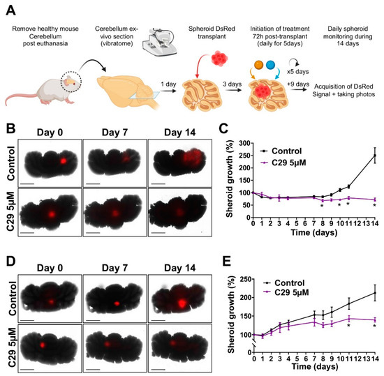 C29 is effective in ex vivo cerebellar organotypic model. (A) Experimental setup. (B,C) Growth of 3D ONS-76 spheroids expressing DsRed transplanted onto mouse cerebellar slices. Then, 72 h after transplantation, spheroids were treated with 5 µM C29 or control (DMSO) for 5 days to assess the growth and dissemination of spheroids. (B) Spheroid growth was monitored by measuring DsRed fluorescence (PheraStar) over 14 days (C) Statistics were performed using Student t-test. * p < 0.05, n = 5. (D,E) Growth of 3D HD-MB03 spheroids expressing DsRed transplanted onto mouse cerebellar slices. Then, 72 h after transplantation, spheroids were treated with C29 (5 and 10 µM) or control (DMSO) for 5 days. Daily (14 days) images, 30 in total, of spheroid growth in each well (JULISdays) were taken (D) Spheroid growth was monitored by measuring DsRed fluorescence (PheraStar) for 14 days (E) Scale bar = 250 µM. Statistics were performed using Student t-test. * p < 0.05, n = 5.