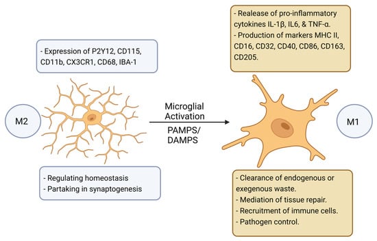Figure 1. A schematic representation of the model proposed for microglial activation [15]. Microglia undergo a transition from M2 “resting” state to M1 “active” state which is induced by various molecular signals. Figure created with BioRender.com (accessed on 1 November 2022).