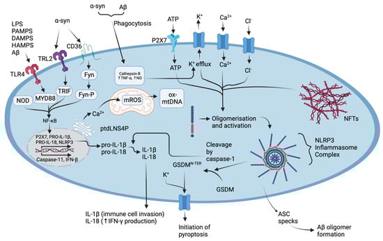 Figure 2. The molecular mechanisms underlying the activation of the NLRP3 inflammasome complex in AD and PD. Abnormal protein aggregates such as Aβ can selectively bind TLR4, SNCA can selectively bind TLR2 and scavenger receptor CD36, or both can be phagocytosed [67]. Phagocytosed Aβ and SNCA drive the production of cathepsins which increase K+ efflux, TNF-α and NO production, and NLRP3 oligomerisation [67,68]. Intracellular messengers such as MYD88, TRIF, and Fyn act to upregulate NF-κB which stimulates the production of proinflammatory cytokine pro-IL-1β, pro-IL-18, the production of NLRP3, and additionally increases the expression of caspase-11 and IFN-β [63,64,67,69,70,71]. The ER drives Ca2+ uptake in mitochondria, along with intracellular ion efflux and promotes mROS production, which in turn drives NLRP3 oligomerisation, also via the release of ptdLNS4P [4,20]. The activation of the inflammasome complex allows pro-caspase-1 to self-cleave forming active caspase-1 which can then induce the maturation of pro-IL-1β and pro-IL-18, cleave GSDMD initiating pyroptosis, drive the invasion of immune cells via increasing the expression of adhesion molecules, sensitise neutrophils to chemo-attractants, and stimulate vasodilation [67,69,70]. Figure created with BioRender.com (accessed on 1 November 2022).