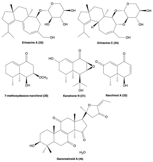 Figure 3. Molecular structures of erinacine A and C (33 & 34), 7-methoxydesoxo-narchinol (30), kanshone N (31), narchinal A (32), and ganoresinoid A (49), all of which possess anti-neuroinflammatory processes [119,120,121,124].