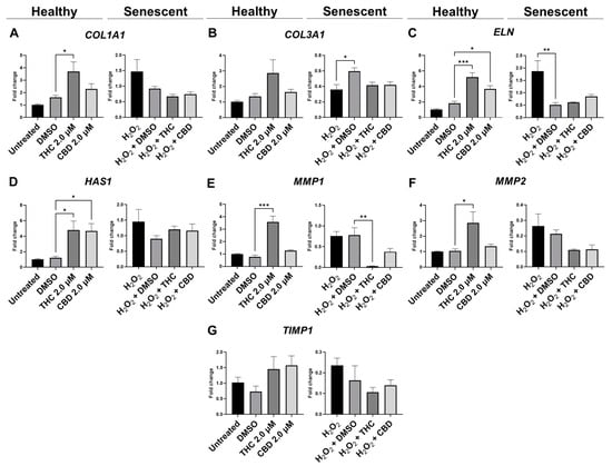 3.5. Protective Effects of Phytocannabinoids on the Expression of Age-Related Genes Involved in Extracellular Matrix Maintenance