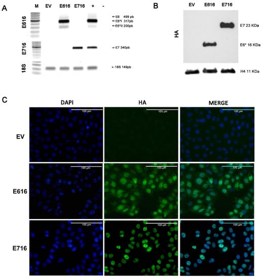 Stable expression of E616 and E716 in C-33 A cells: (A) RT-PCR showing the expression of E6, E6*I, and E6*II mRNA in C33-E616 cells, as well as the E7 mRNA in C33-E716 cells. 18S rRNA expression was used as a control. (B) Detection of HA-tagged E6 and E7 proteins by WB in stable C-33 A cell lines using HA antibody. H4 protein was used as the loading control; (C) Immunofluorescence staining using DAPI nuclear detection (blue) and anti-HA primary antibody to detect E6 and E7 oncoproteins (green). A representative image of each experiment is shown. Scale bar represents 100 µm long.