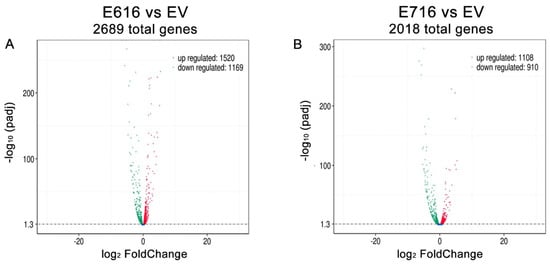 E616 and E716 differentially affected gene expression in C-33 A cells. Volcano plot illustrating the genes that were significantly (p-adj < 0.05) deregulated in: (A) C33-E616 cells and (B) C33-E716 cells, compared with the EV control. The upregulated genes are depicted in red color and the downregulated ones in green.