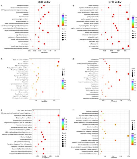 Enrichment analysis of differentially expressed genes (DEGs) in cells containing E616 and E716 oncoproteins. Dot plots of the 20 biological functions or pathways more significantly related with the DEGs modulated by E616 and E716 are depicted. Enrichment analysis was performed using data from GO for (A) E6- and (B) E7-expressing cells; while KEGG analysis exhibited cellular pathways affected in (C) E6- and (D) E7-containing cells. Reactome analysis showed processes associated with (E) E6 and (F) E7 expression. Significantly deregulated processes (p-adj < 0.05) were depicted in red color. Count means the number of genes assigned to a term. GeneRatio refers to the number of observed genes (DEGs) divided by the number of expected genes related to each category.